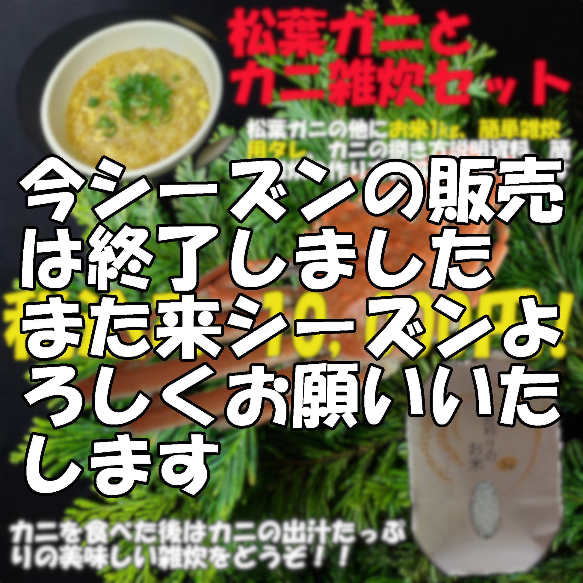 ・松葉ガニ1枚(400ー500g ユビ落ちの場合もあります)、雑炊用のお米1㎏に簡単雑炊用タレをお付けします